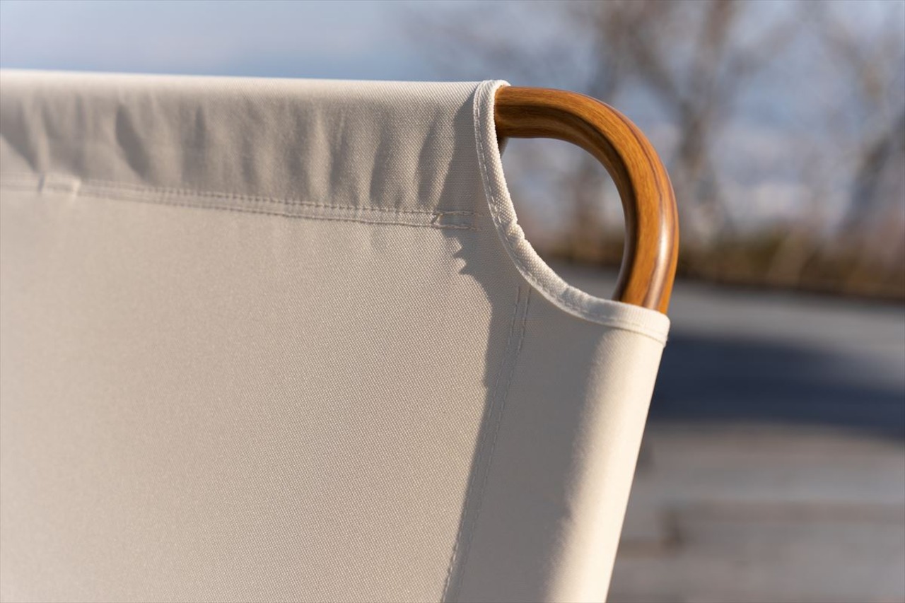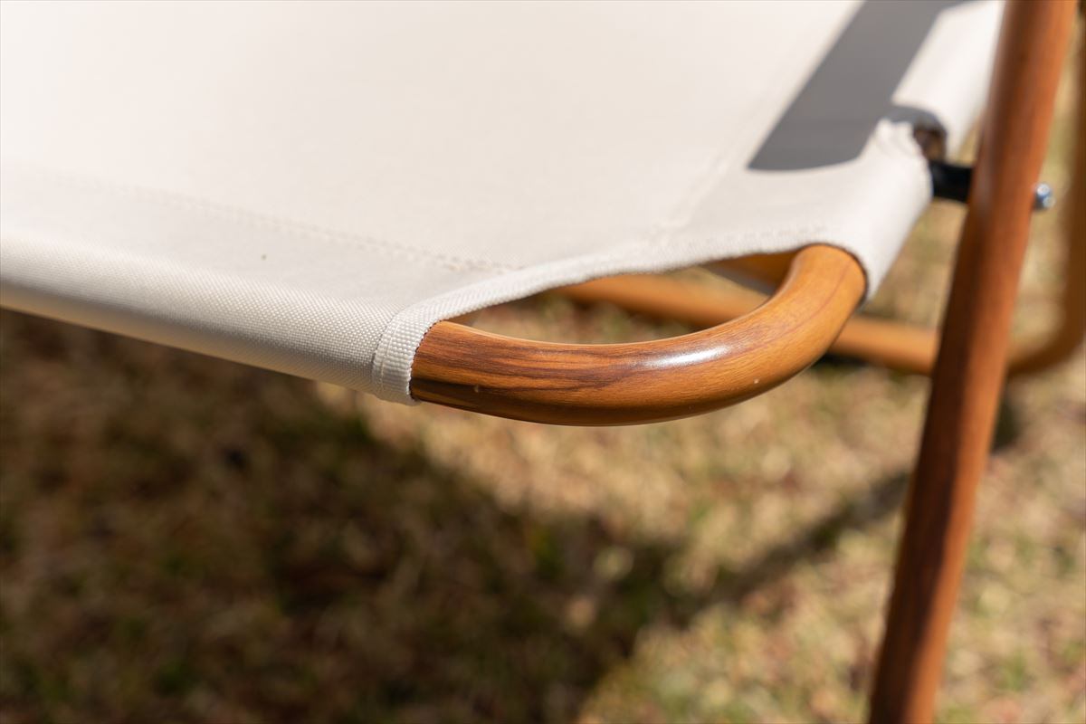 木目調のアルミフレームと天然木のアームレストがナチュラルな雰囲気を演出する、折りたたみベンチチェア