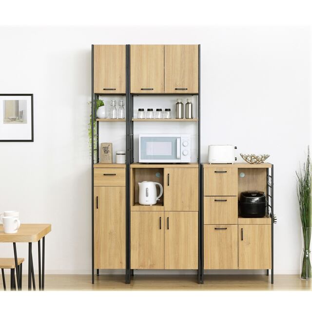 スチールと木目調の組み合わせ。スタイリッシュなデザインの食器棚です。