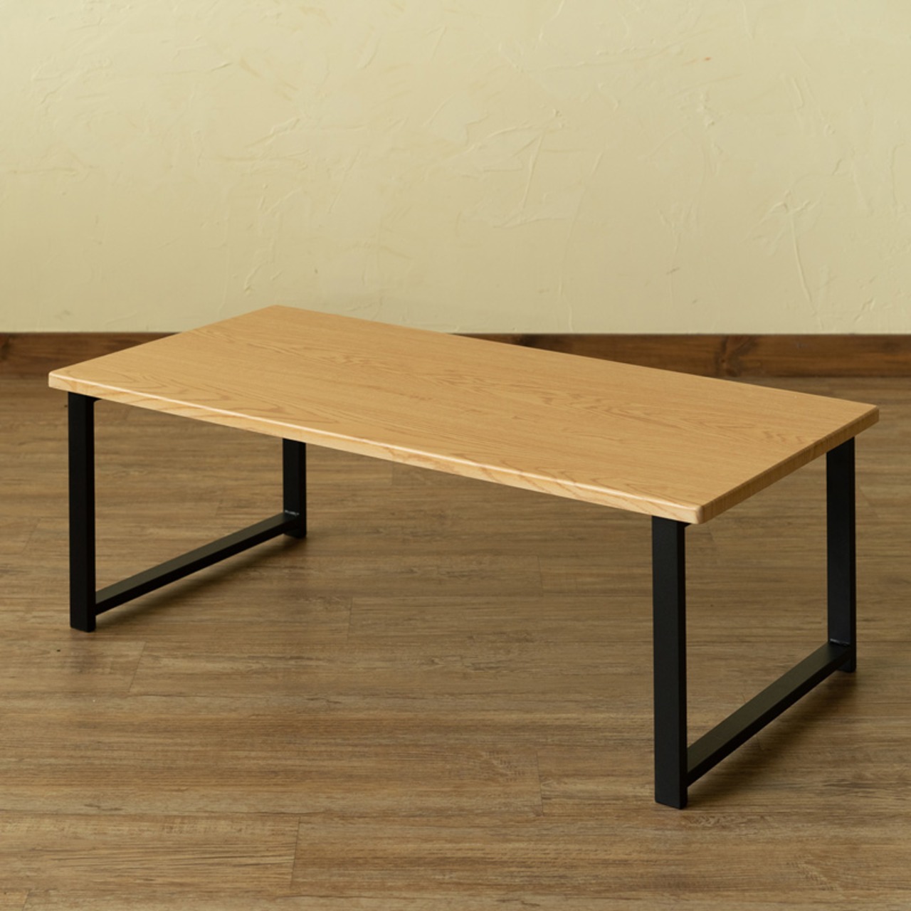 木目調の天板とスチール脚のテーブルです